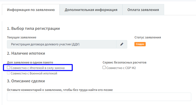 3.3. В поле «Описание сделки» можете прописать опознавательные знаки сделки, чтобы в дальнейшем вам было удобнее найти сделку в общем списке. Например, можете написать фамилии участников ДДУ или номер договора. Если есть ипотека, то обязательно поставьте галочку «Ипотека в силу закона»