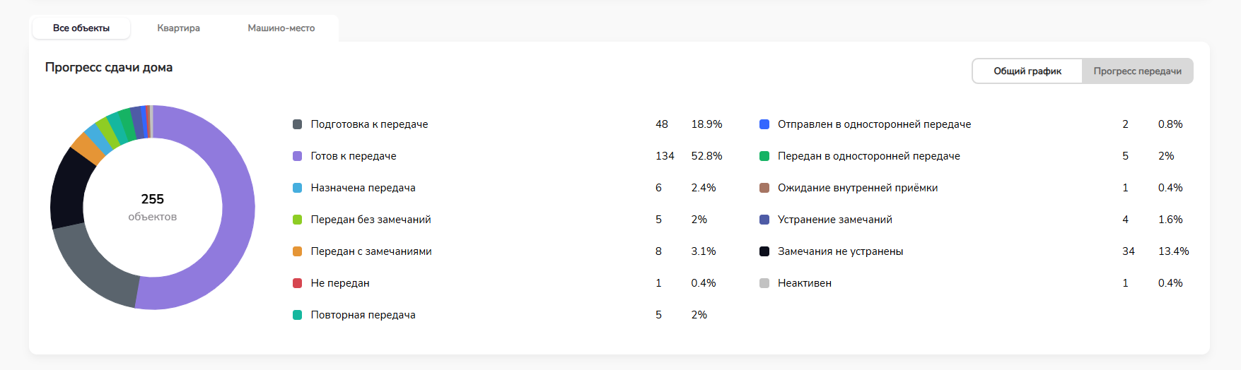 На дашборде видно прогресс сдачи дома: сколько помещений в каком статусе на данный момент.