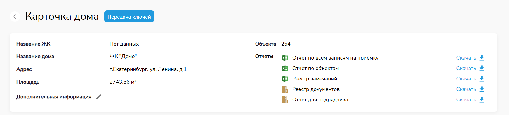 В карточке дома вы увидите подробную информацию, а также поле "Дополнительная информация", которая используется в печатных формах. К примеру туда можно написать юридический адрес дома или корпус.