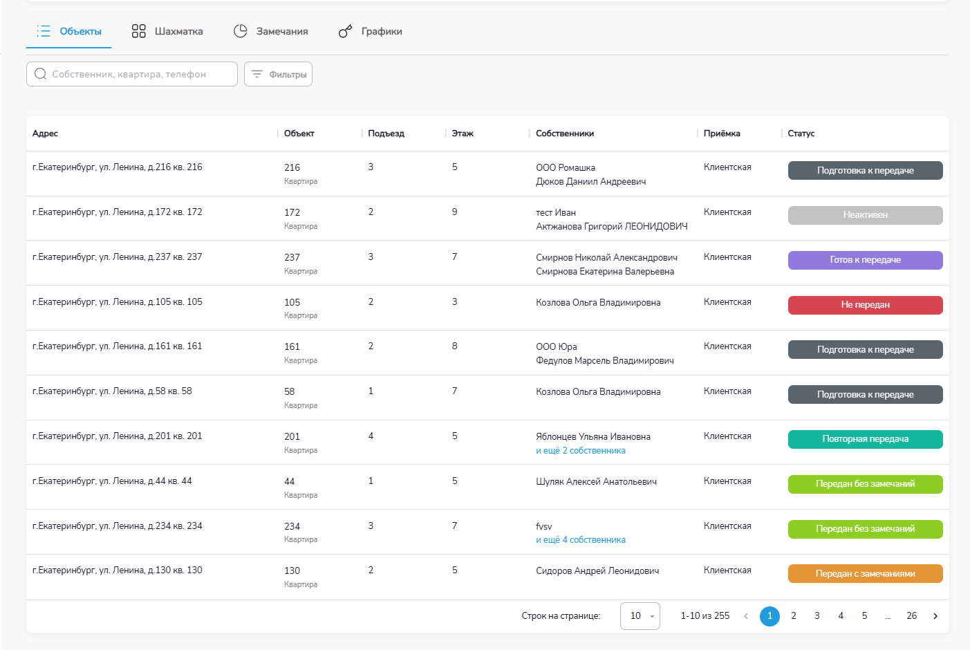 - Поле поиска работает и по номеру квартиры, и по ФИО собственника и его номеру телефона