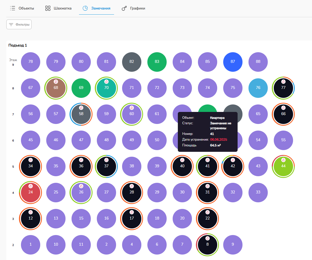 На этой вкладке также вы увидите шахматку со статусами помещений, но каждое представлено в виде диаграммы, отображающей в процентом соотношении сколько замечаний в каком статусе находятся.