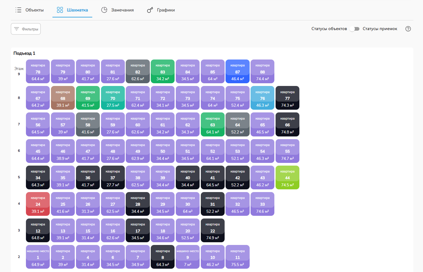 - На шахматке помещения представлены в виде квадратов разных цветов соответствующий статусам помещений.