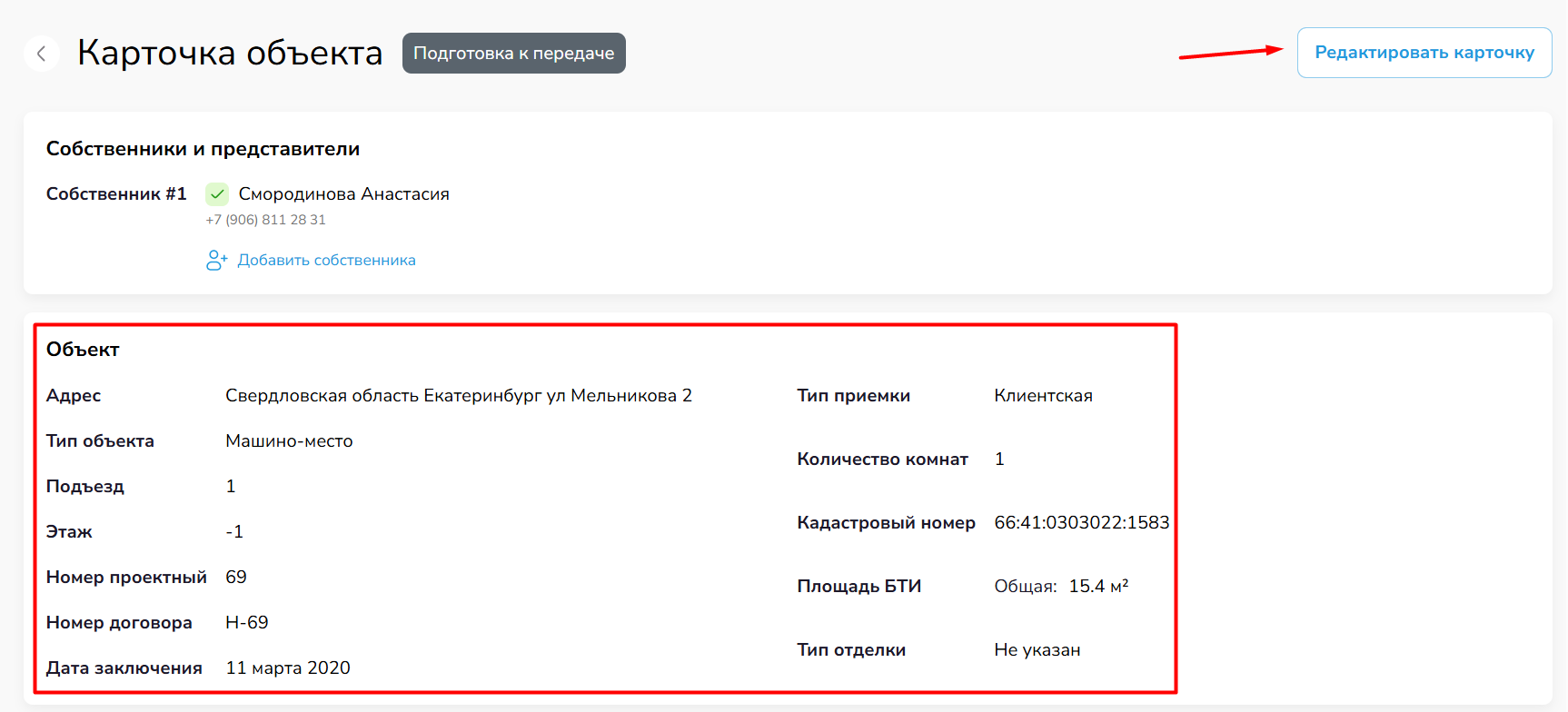 3. Откроется карточка объекта, при необходимости можете её отредактировать по кнопке в левом верхнем углу экрана.