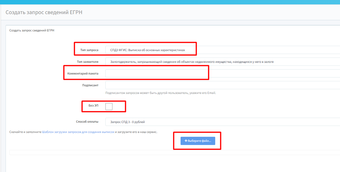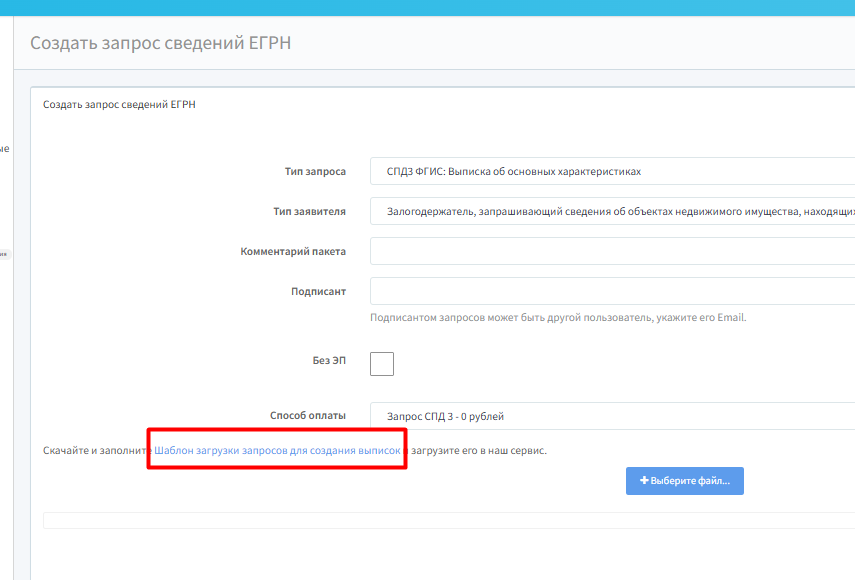 4...Возвращаемся в сервис и сначала заполняем поля формы: выбираем нужный тип запроса, даем название пакету, ставим галочку "Без ЭП". Затем через кнопку "Выберите файлы" загружаем ранее заполненный шаблон