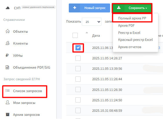 6. Результат можно скачать в разделе Список запросов по кнопке "Сохранить", когда статус пакета будет "Завершен"