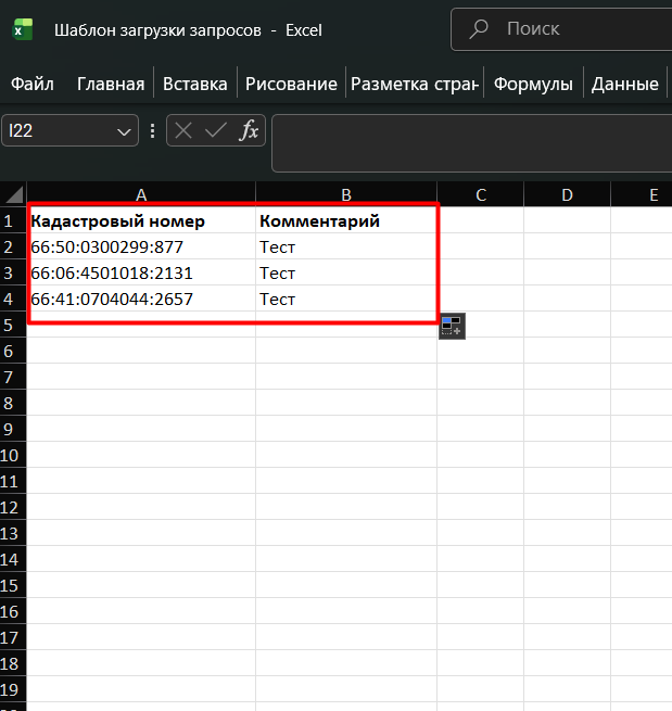 3...В шаблоне обязательно заполняем обе колонки, и кадастровый номер и комментарий