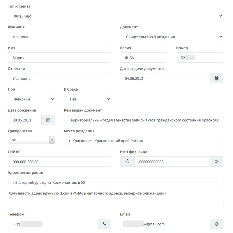 *при заполнении данных ребенка до 14 лет можно продублировать контакты родителя