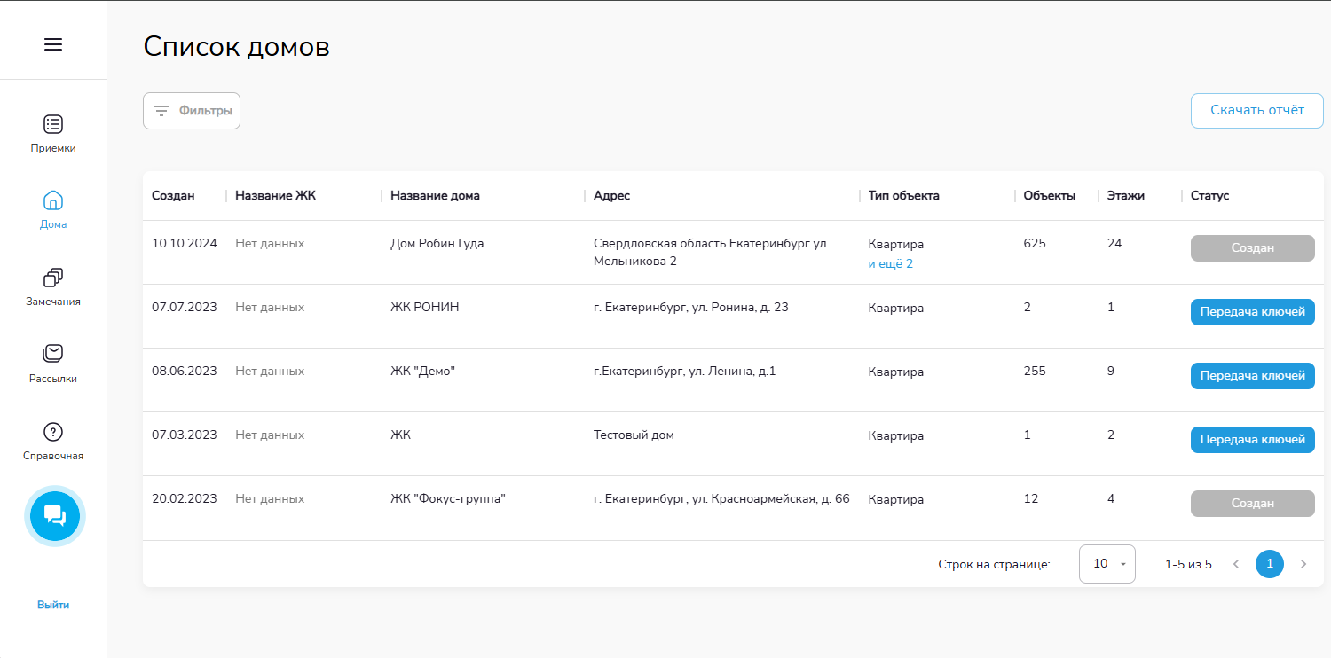 Тут также можно скачать отчёты по всем домам, только помните что чем больше данных должны попасть в отчёт, тем дольше он формируется, так что луче будет перейти в карточку Дома и загрузить отчёт от туда